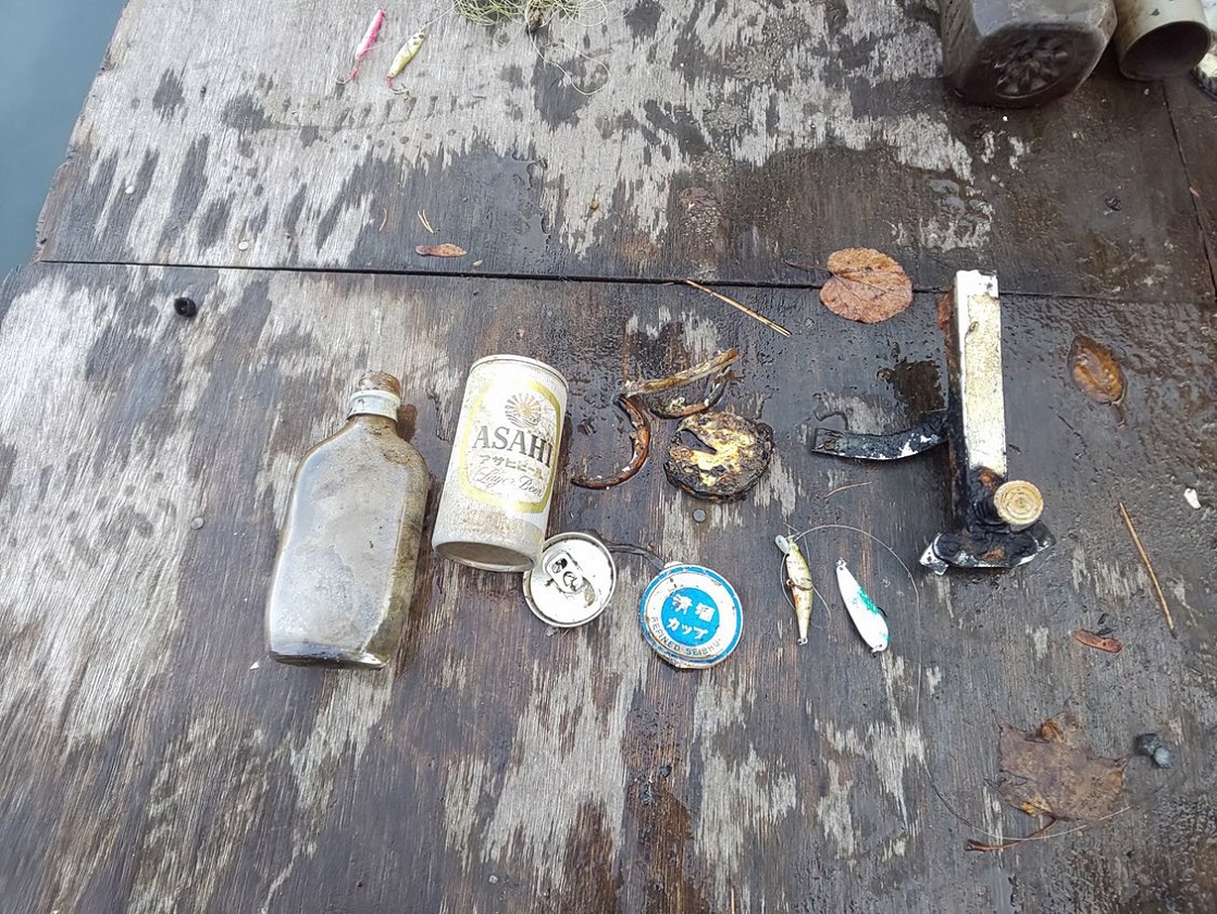 空き缶やウイスキー瓶、ルアー、釣り固定具など多くのゴミが回収されました。