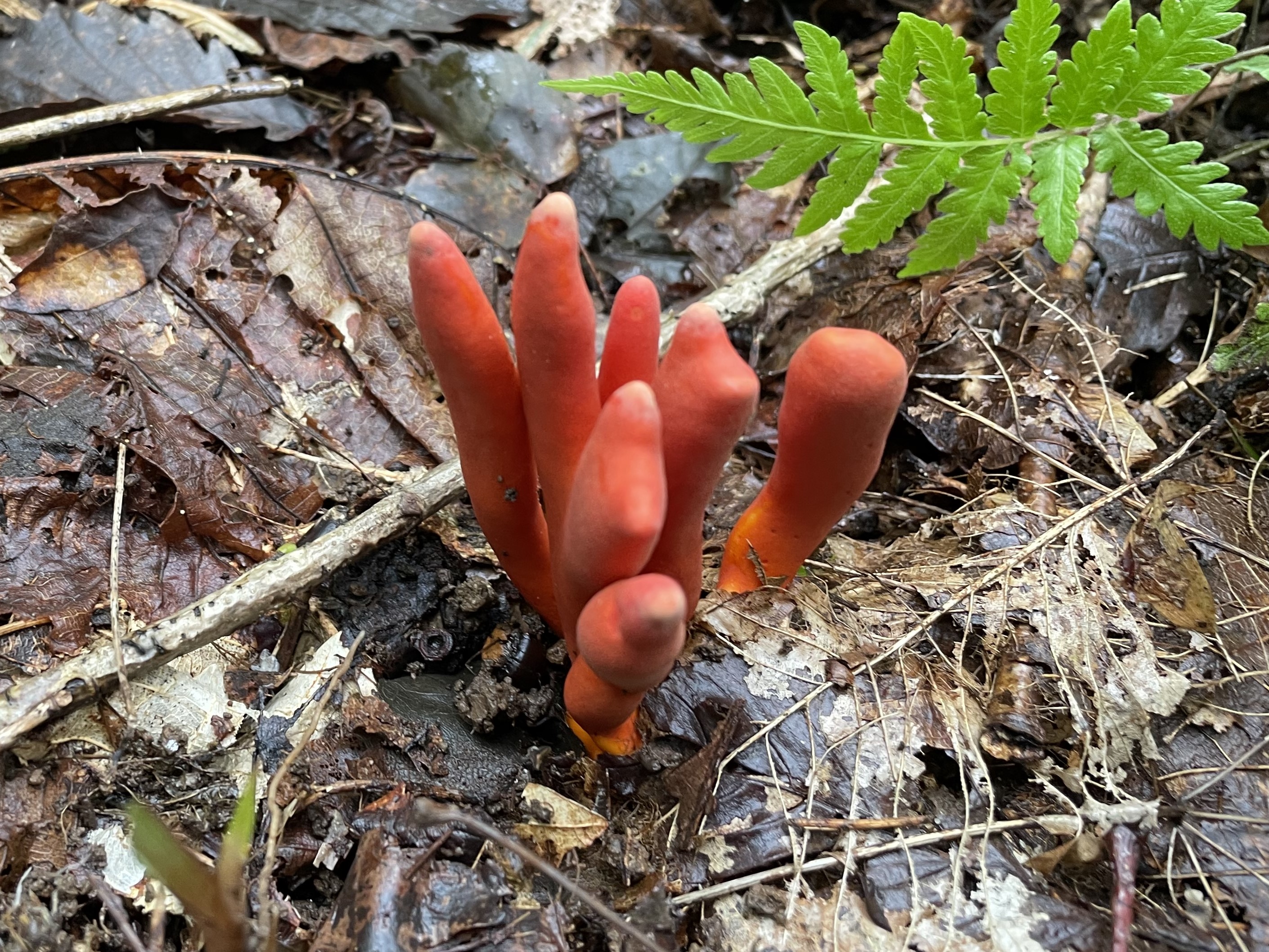 ニクザキン科ツノタケ属の有毒キノコ「カエンタケ」が令和6年8月に白神岳登山道で確認されました。