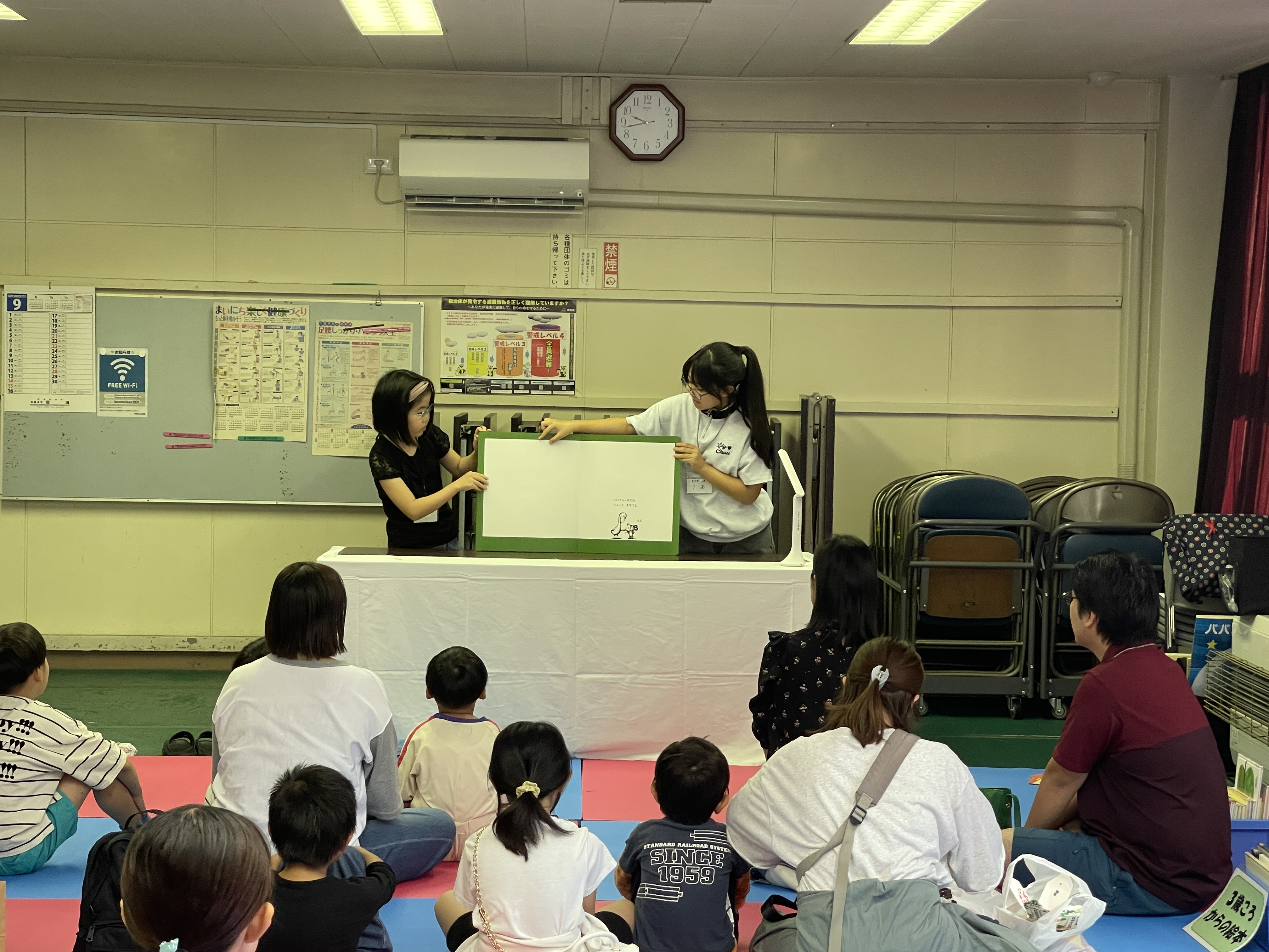 オープニングセレモニーとして、みよし保育園さんのマーチングから始まり、「お菓子づくりコーナー」、「牛乳パックコマづくりコーナー」、「元気運動コーナー」、「ほほえみコーナー」、「子ども司書の絵本の読み聞かせ」などを実施し、来場者全員で楽しんでいました。