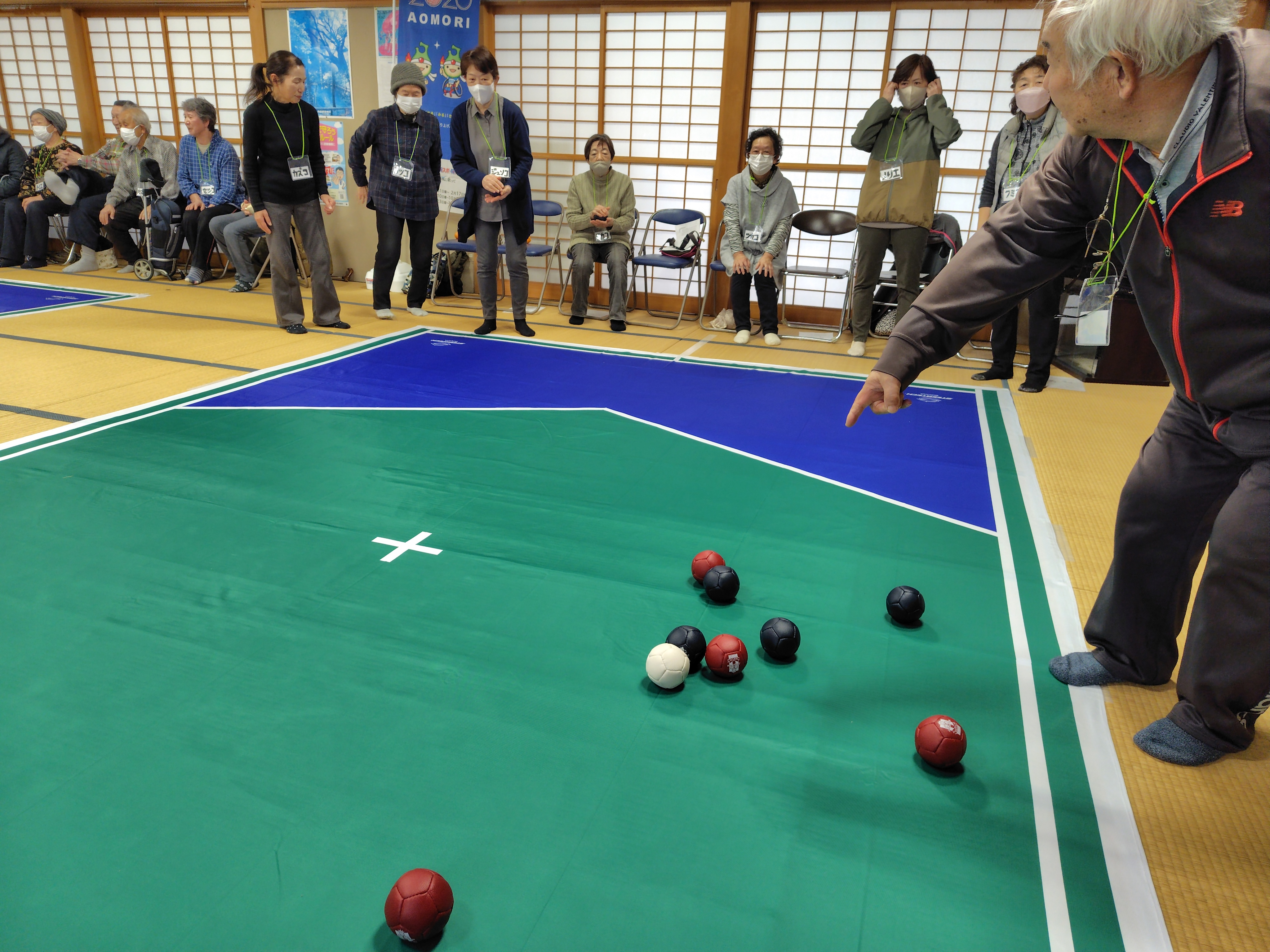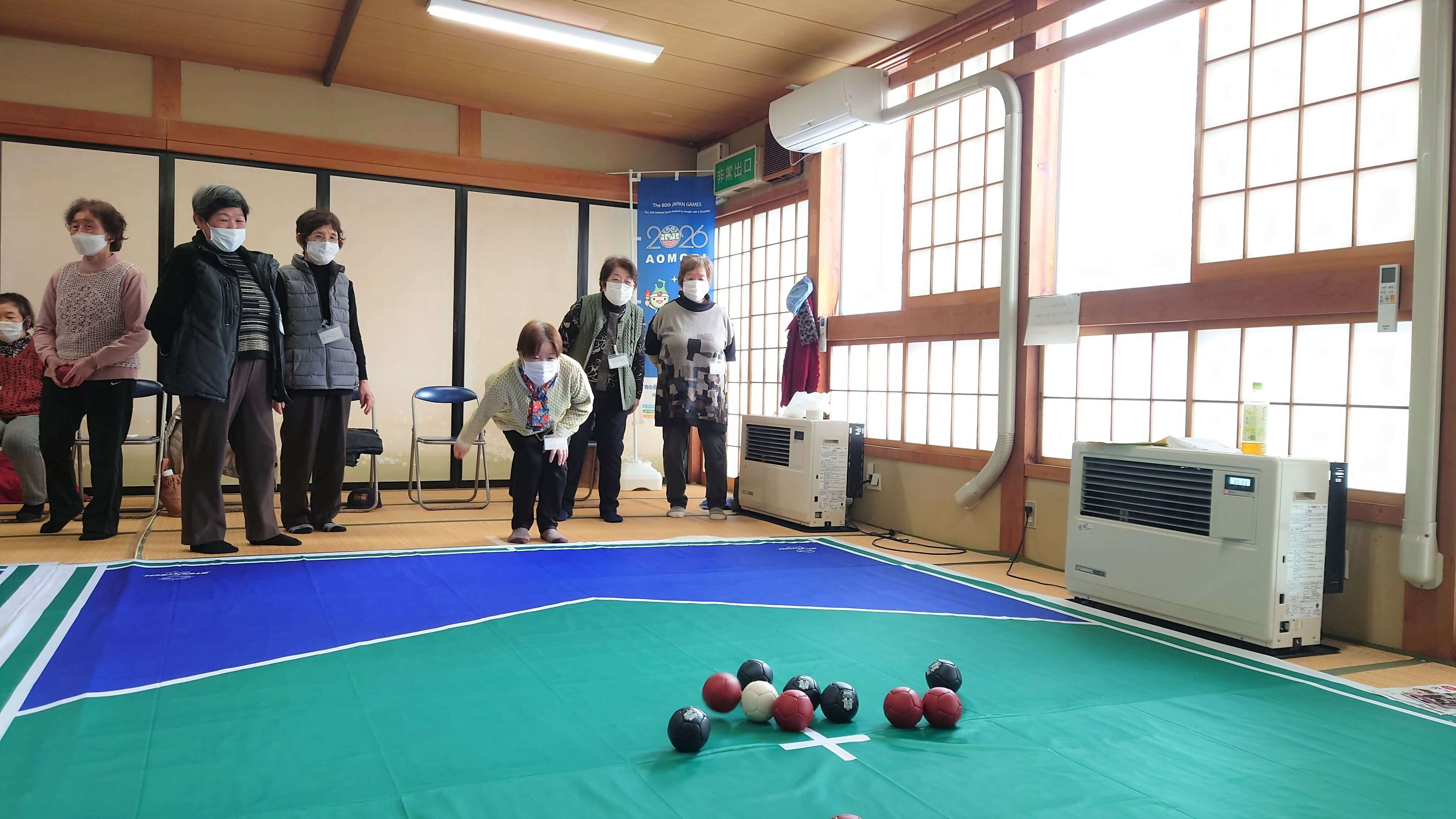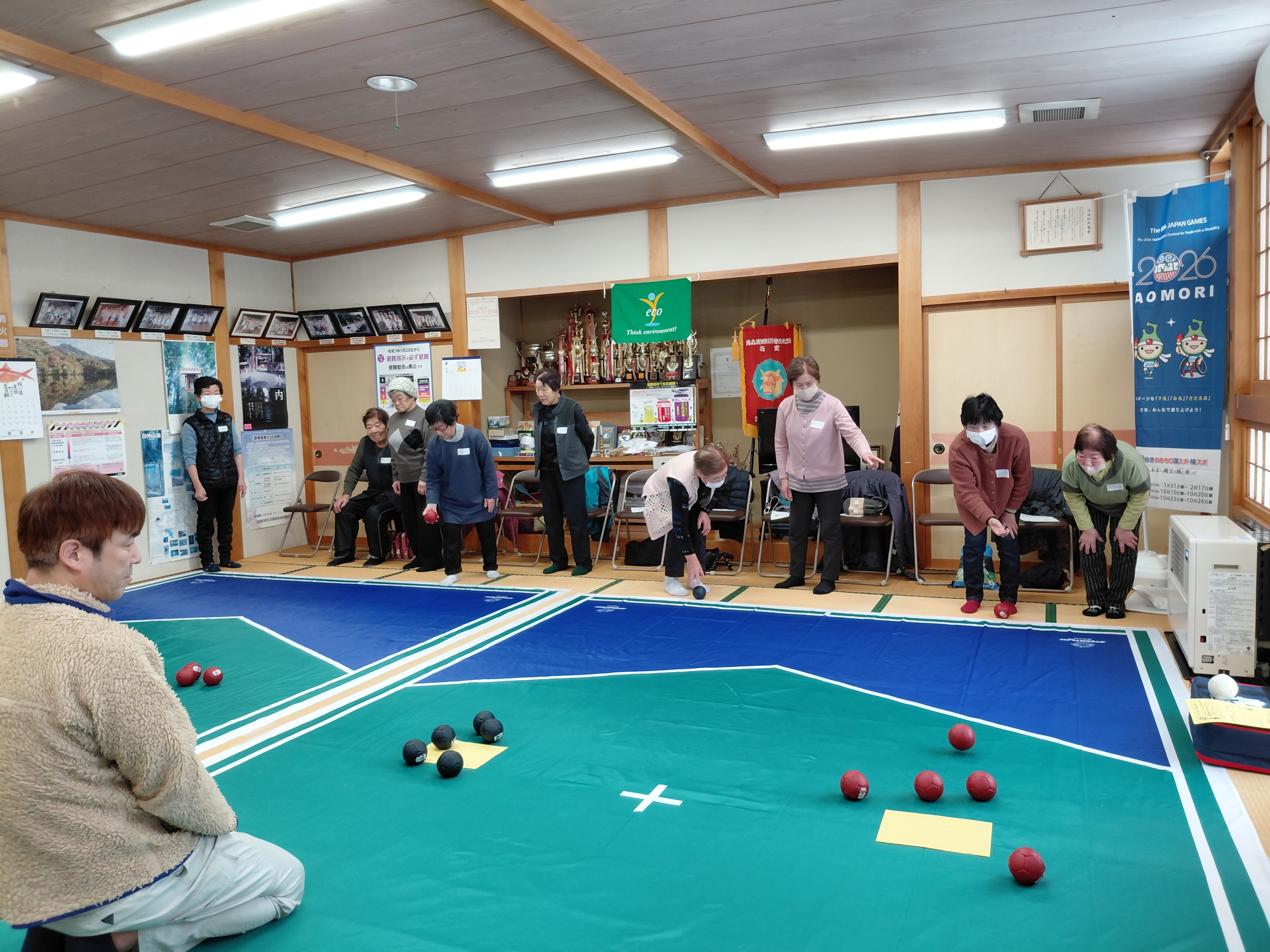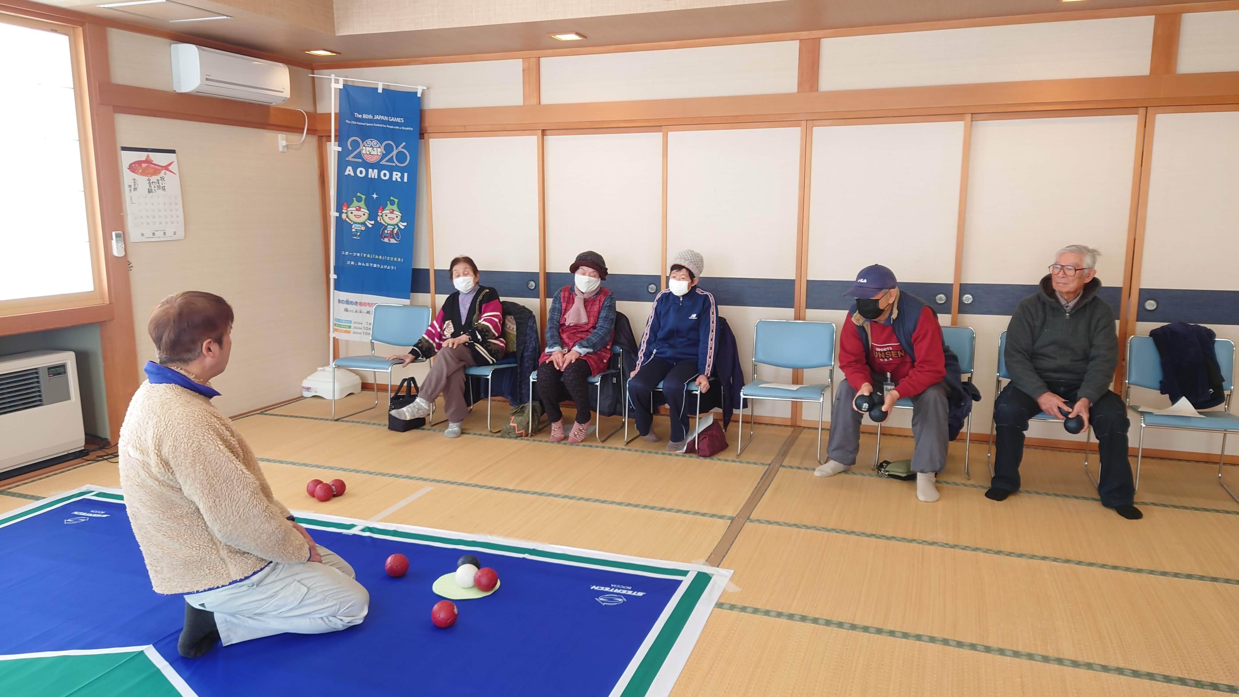 ボッチャは、2026年に青森県で開催される第25回全国障害者スポーツ大会「青の煌めきあおもり障スポ」の実施競技の1つです。青森県からのぼり旗をお借りして、大会のPRも行いました。